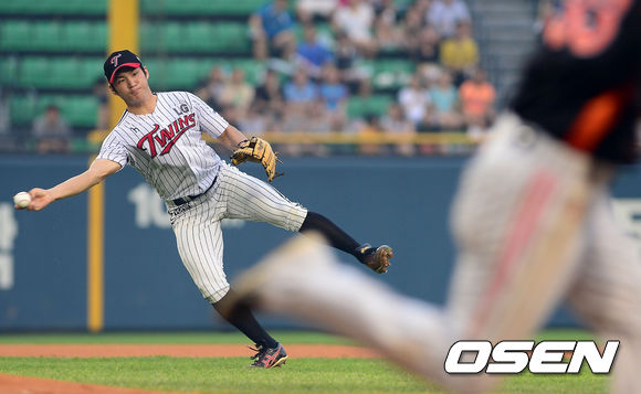 9일 오후 잠실구장에서 열린 '2013 한국야쿠르트 세븐프로야구' LG 트윈스와 롯데 자이언츠의 경기, 2회초 2사 LG 오지환이 롯데 정훈의 내야 땅볼 타구를 잡아 1루로 송구하고 있다.