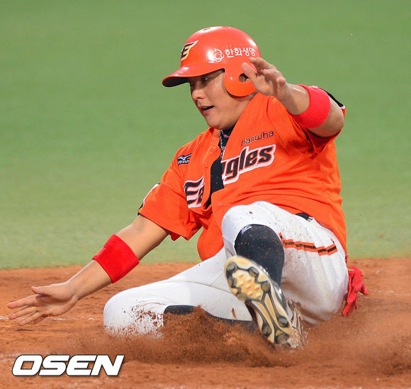 9일 오후 대구구장에서 열린 '2013 한국야쿠르트 세븐 프로야구' 삼성 라이온즈와 한화 이글스의 경기 2회초 1사 만루 한화 이양기의 2타점 적시타때 2루 주자 김태균이 홈쇄도해 세이프되고 있다.