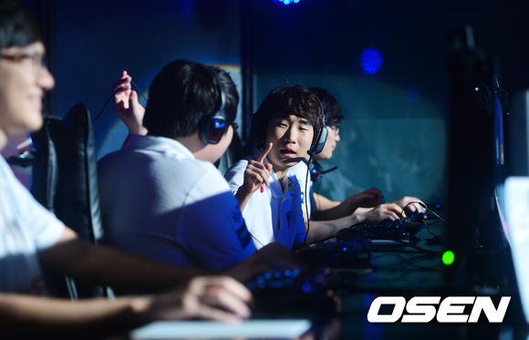 9일 오후 서울 용산 온게임넷 e스포츠상설경기장에서 '2013 LOL 챔피언스 리그(이하 롤챔스)' 서머 시즌 8강전 2회차 CJ 프로스트와 나진 실드의 경기에서 CJ프로스트의 '빠른별' 정민성이 동료들과 얘기를 나누고 있다.