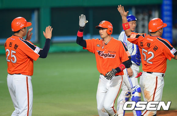 9일 오후 대구구장에서 열린 '2013 한국야쿠르트 세븐 프로야구' 삼성 라이온즈와 한화 이글스의 경기 3회초 1사 1,3루 한화 송광민이 3점 홈런을 날리고 최진행, 김태균과 하이파이브를 하고 있다