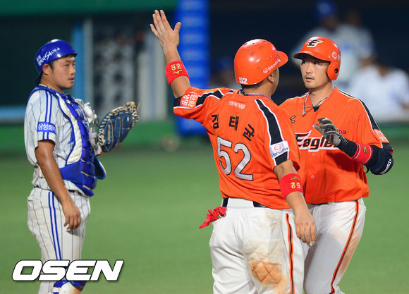 9일 오후 대구구장에서 열린 '2013 한국야쿠르트 세븐 프로야구' 삼성 라이온즈와 한화 이글스의 경기 3회초 1사 1,3루 한화 송광민이 3점 홈런을 날리고 최진행, 김태균과 하이파이브를 하고 있다