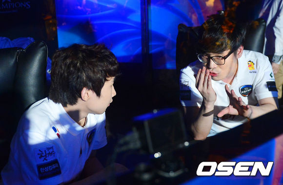 9일 오후 서울 용산 온게임넷 e스포츠상설경기장에서 '2013 LOL 챔피언스 리그(이하 롤챔스)' 서머 시즌 8강전 2회차 CJ 프로스트와 나진 실드의 경기에서 CJ프로스트의 '빠른별' 정민성이 1세트에 승리를 한 후 '클템' 이현우와 얘기를 나누고 있다.