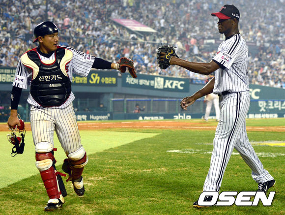 9일 오후 잠실구장에서 열린 '2013 한국야쿠르트 세븐프로야구' LG 트윈스와 롯데 자이언츠의 경기, LG 리즈와 윤요섭이 5회초 수비를 마치고 더그아웃으로 들어오면서 하이파이브를 하고 있다.