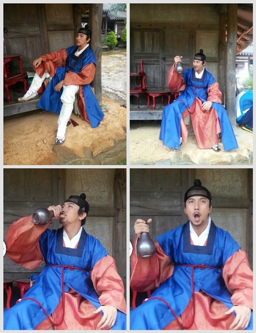 사진 속 박건형은 세트 마루에 기대앉아 시름에 잠긴 표정을 짓더니 술을 마시고 밝은 표정으로 바뀌었다.