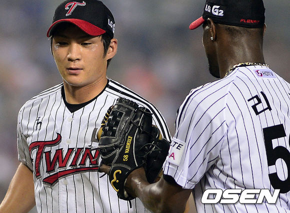 9일 오후 잠실구장에서 열린 '2013 한국야쿠르트 세븐프로야구' LG 트윈스와 롯데 자이언츠의 경기, 7회초 LG 리즈가 세 타자 연속 유격수 앞 땅볼로 이닝을 마친 뒤 오지환과 하이파이브를 하고 있다.