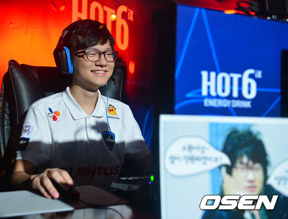9일 오후 서울 용산 온게임넷 e스포츠상설경기장에서 '2013 LOL 챔피언스 리그(이하 롤챔스)' 서머 시즌 8강전 2회차 CJ 프로스트와 나진 실드의 경기에서 CJ프로스트의 '매드라이프' 홍민기가 2세트를 마친 후 기뻐하고 있다.
