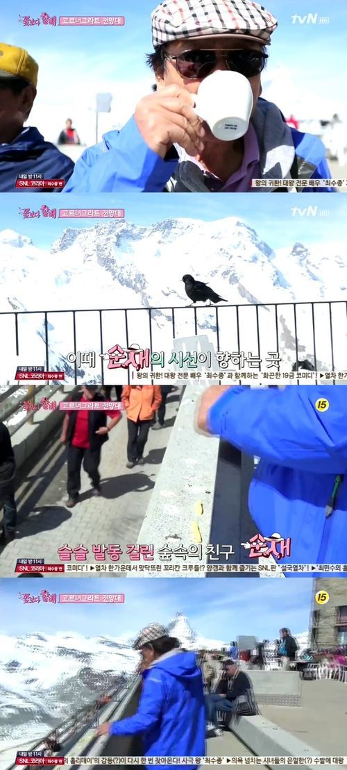 이순재는 9일 오후 방송된 tvN 예능프로그램 '꽃보다 할배'(이하 '꽃할배')에서 스위스 체르마트의 마테호른 산에 올라 커피를 마시며 근처에 모여든 까마귀 떼를 위해 과자를 던져주며 동물 애호가(?)의 면모를 드러냈다.
