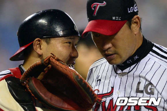 9일 오후 잠실구장에서 열린 '2013 한국야쿠르트 세븐프로야구' LG 트윈스와 롯데 자이언츠의 경기, 8회초 2사 만루 위기를 넘긴 LG 윤요섭과 봉중근이 이야기를 나누고 있다.