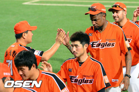 경기종료 후 승리투수가 된 한화 바티스타가 김성한과 하이파이브를 하고 있다. / soul1014@osen.co.kr