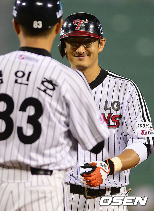 9일 오후 잠실구장에서 열린 '2013 한국야쿠르트 세븐프로야구' LG 트윈스와 롯데 자이언츠의 경기, 8회말 1사 2루 LG 박용택이 적시타를 올린 뒤 미소를 짓고 있다.