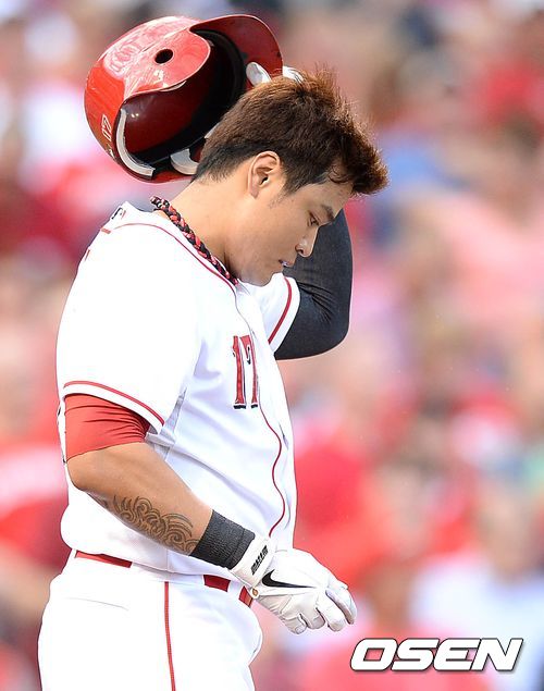 2회말 2사 1루에서 신시내티 추신수가 삼진으로 물러나고 있다.