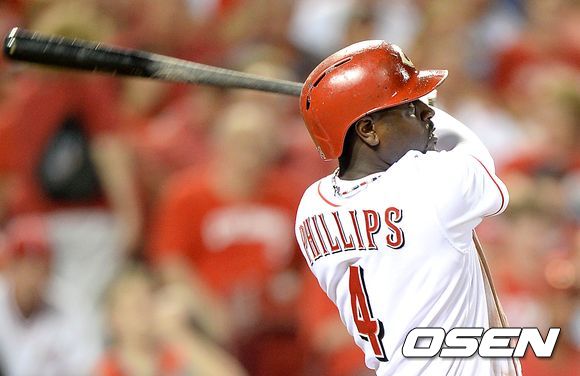 7회말 1사 2루에서 신시내티 필립스가 좌월 투런 홈런을 치고 있다.