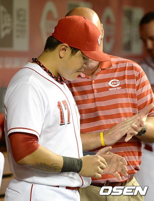 신시내티 추신수가 덕아웃에서 관계자와 이야기를 나누고 있다. /sunday@osen.co.kr
