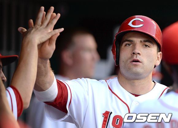 3회말 1사 3루에서 신시내티 브루스의 우전 적시타때 홈을 밟은 3루주자 보토가 덕아웃에서 동료들과 하이파이브를 하고 있다. /sunday@osen.co.kr