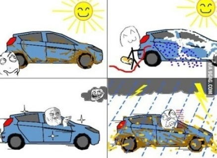 만화를 보면 해가 쨍쨍한 맑은 날씨에 주인공은 기분 좋게 세차를 한다. 더러워진 차를 깨끗하게 닦으며 웃는 표정도 보인다. 세차할 때 날씨는 맑았다.