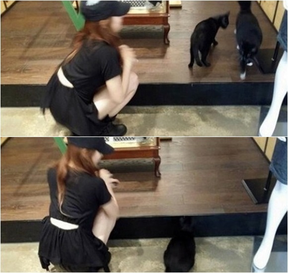 사진 속 수지는 바닥에 쭈그려 앉아 검은색 고양이들을 바라보고 있다. 허리 부분이 절개된 검은색 원피스를 입은 수지의 뒷모습은 가녀리고, 허리는 유난히 잘록하다.