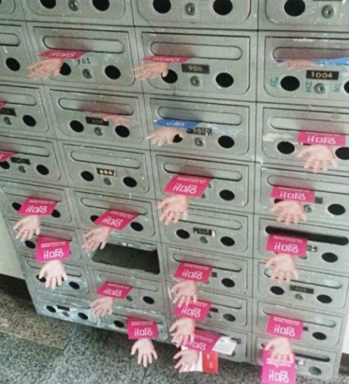 공개된 사진 속 한 아파트 우편함에는 "엄마!"라고 적혀진 전단지가 수십개 꽂혀 있다. 이 전단지에는 손바닥을 뒤집어 놓은 그림이 그려져 있어 친근함보다는 되레 거부감을 준다.