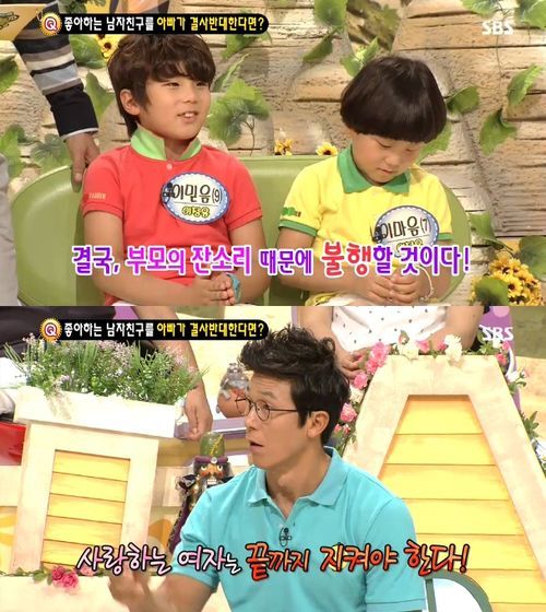 아들의 말에 이정용은 "사랑하는 여자는 끝까지 지켜야 한다"고 외쳤다. 이믿음은 "만약 친할머니가 엄마를 반대하면 어떻게 하겠냐"고 묻자 이정용은 "어머님 말씀 따라야겠다"고 아들에게 했던 말과 다른 대답을 해 웃음을 자아냈다.