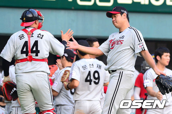 10일 오후 서울 잠실구장에서 열린 '2013 한국야쿠르트 세즌 프로야구' 두산 베어스와 LG 트윈스의 경기 1회말 무사 1,2루 위기에서 무실점으로 두산 공격을 막은 LG 선발투수 류제국이 윤요섭 포수와 하이파이브를 하며 더그아웃으로 들어가고 있다.