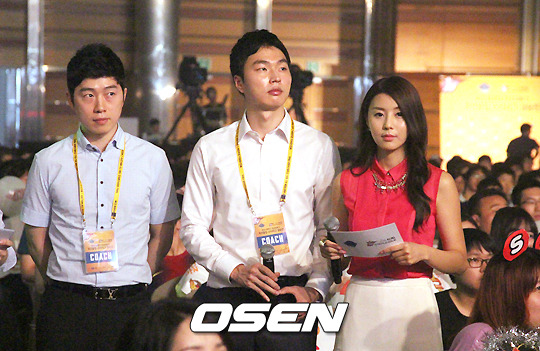 3세트 종료후 정윤종이 2-1로 앞서가는 가운데 스타리그 리포터 이유라가 양팀의 감독인 임요환과 박외식과 함께 결승전에 대한 인터뷰를 하고 있다.