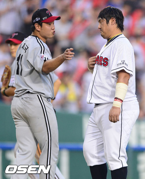 10일 오후 서울 잠실구장에서 열린 '2013 한국야쿠르트 세즌 프로야구' 두산 베어스와 LG 트윈스의 경기 4회초 이닝종료 후 LG 류제국이 최준석과 이야기를 나누고 있다. 3회말 2사 만루 두산 오재원의 타석때 2루 주자 최준석이 타자에게 사인을 가르쳐주지 않았냐며 류제국이 홍성흔에게 어필했다.