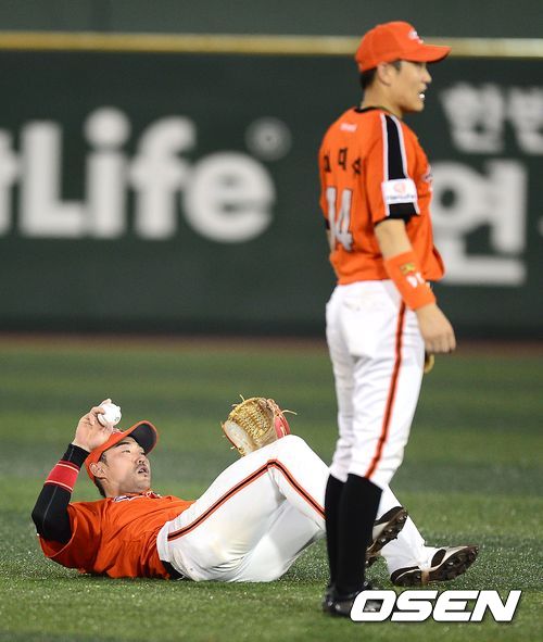 10일 오후 서울 목동야구장에서 열린 '2013 한국야쿠르트 세븐 프로야구' 넥센 히어로즈와 한화 이글스의 경기, 4회말 1사에서 한화 송광민이 넥센 강정호의 플라이 타구가 조명에 들어가자 넘어지며 가까스로 잡아내고 있다.