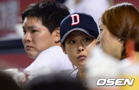 10일 오후 서울 잠실구장에서 열린 '2013 한국야쿠르트 세즌 프로야구' 두산 베어스와 LG 트윈스의 경기 방송인 현영이 남편과 함께 관전하고 있다.