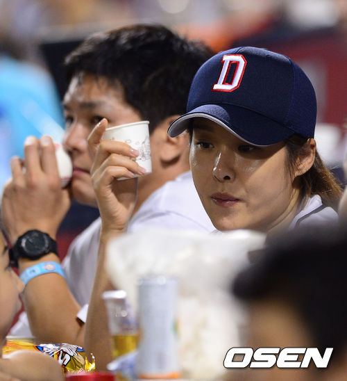 10일 오후 서울 잠실구장에서 열린 '2013 한국야쿠르트 세즌 프로야구' 두산 베어스와 LG 트윈스의 경기 방송인 현영이 남편과 함께 경기를 관전하고 있다