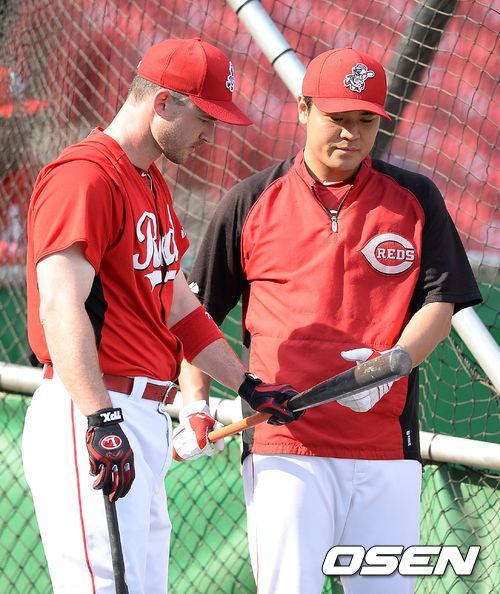 경기에 앞서 신시내티 추신수가 동료 해너핸과 배트를 바라보며 이야기를 나누고 있다.