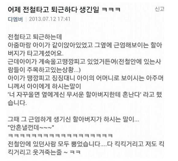 게시물 내용은 전철을 타고 있는 아줌마가 아이가 계속울고 징징대자 울음을 그치기 위해 할아버지에게 구원 요청을 한 내용인데 정작 근엄한 할아버지는 "안혼낼껀데~~~"하며 농담어린 얘기로 전철안 사람들에게 웃음바다를 만들었다는 얘기이다.