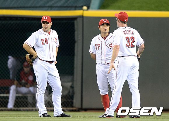 8회초 투수교체 때 신시내티 추신수가 외야진과 이야기를 나누고 있다. /sunday@osen.co.kr