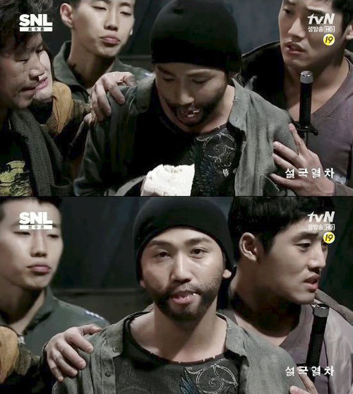 유세윤은 지난 10일 오후 11시 방송된 tvN 'SNL 코리아' 설국열차 코너에 지배 계층 메이슨(장면옥분)에게 맞서는 인물로 등장해 단백질블록이 지겹다며 항변하자 개그우먼 정명옥이 '설국열차' 중 나왔던 단백질블록을 대신해 두부를 건네주자 유세윤은 두부를 우걱우걱 먹으며 주변에 있던 동료 배우들에게 위로를 받았다.