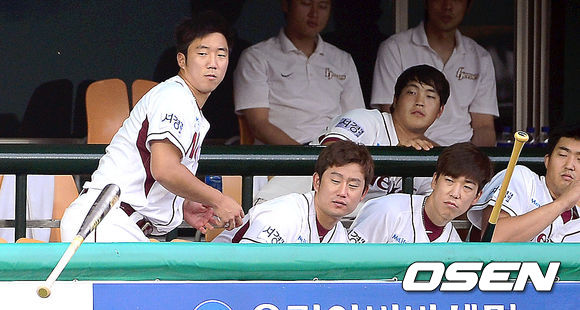 11일 오후 서울 목동구장에서 열린 '2013 한국야쿠르트 세븐프로야구' 넥센 히어로즈와 한화 이글스의 경기, 2회초 1사 넥센 선수들이 더그아웃으로 날아온 이양기의 배트를 피하고 있다.