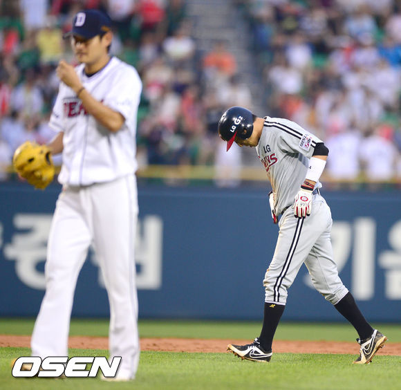 11일 오후 서울 잠실구장에서 열린 '2013 한국야쿠르트 세즌 프로야구' 두산 베어스와 LG 트윈스의 경기, 5회초 무사 2루 LG 오지환의 타석때 2루 주자 권용관이 견제사 당한뒤 더그아웃으로들어가고 있다.