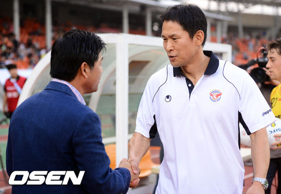 11일 오후 탄천 종합운동장에서 열린 '현대오일뱅크 K리그 클래식 2013' 22라운드 성남일화와 부산아이파크의 경기에 앞서 안익수 감독과 윤성효 감독이 악수를 나누고 있다.
