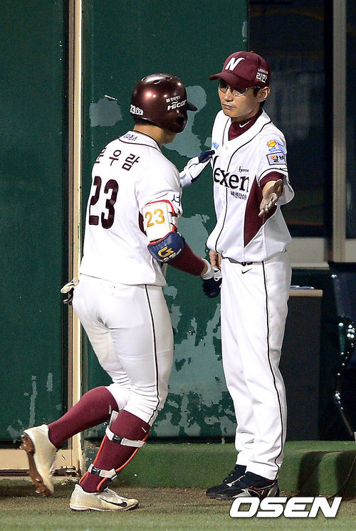 11일 오후 서울 목동구장에서 열린 '2013 한국야쿠르트 세븐프로야구' 넥센 히어로즈와 한화 이글스의 경기, 6회말 무사 넥센 염경엽 감독이 솔로포를 때린 문우람과 하이파이브를 하고 있다.