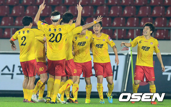 11일 오후 탄천 종합운동장에서 열린 '현대오일뱅크 K리그 클래식 2013' 22라운드 성남일화와 부산아이파크의 경기 후반전, 성남 김동섭의 선제골로 성남 선수들이 기뻐하고 있다.