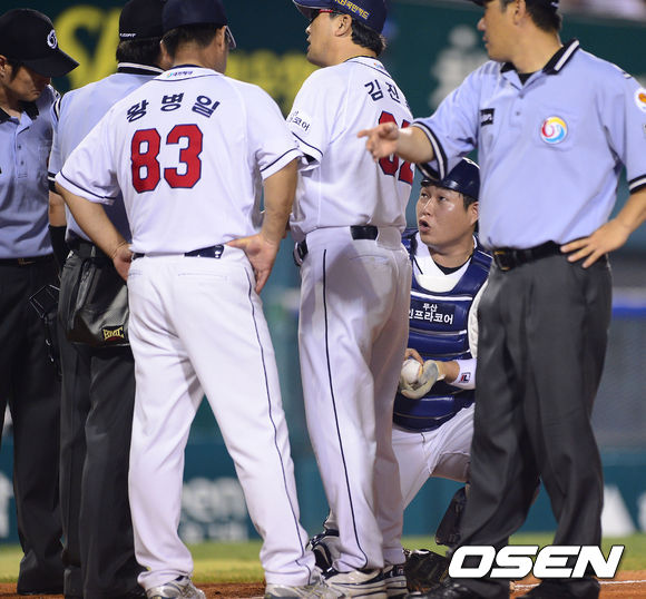 11일 오후 서울 잠실구장에서 열린 '2013 한국야쿠르트 세즌 프로야구' 두산 베어스와 LG 트윈스의 경기,7회초 1사 1,3루 LG 권용관의 타석 이중도루 시도한 3루 주자 이대형이 홈에서 세이프됐다. 판정에 김진욱 감독과 양의지가 우효동 심판에게 항의하고 있다