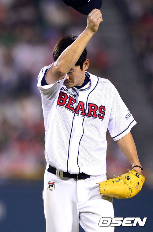 11일 오후 서울 잠실구장에서 열린 '2013 한국야쿠르트 세즌 프로야구' 두산 베어스와 LG 트윈스의 경기,7회초 1사 2루 LG 권용관에게 1타점 적시타를 허용한 두산 선발투수 노경은이 교체되고 있다. 노경은은 이날 6⅓이닝 2실점 기록했다.