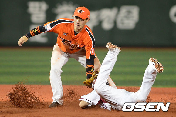11일 오후 서울 목동구장에서 열린 '2013 한국야쿠르트 세븐프로야구' 넥센 히어로즈와 한화 이글스의 경기, 9회말 1사 1,2루 한화 한상훈이 2루 도루를 시도하는 넥센 유재신을 태크아웃으로 잡아내고 있다.
