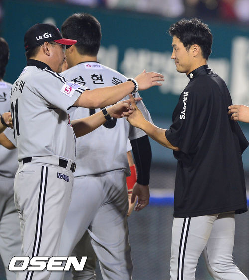 경기종료 후 김기태 감독이 승리투수가 된 신재웅을 격려하고 있다. / soul1014@osen.co.kr