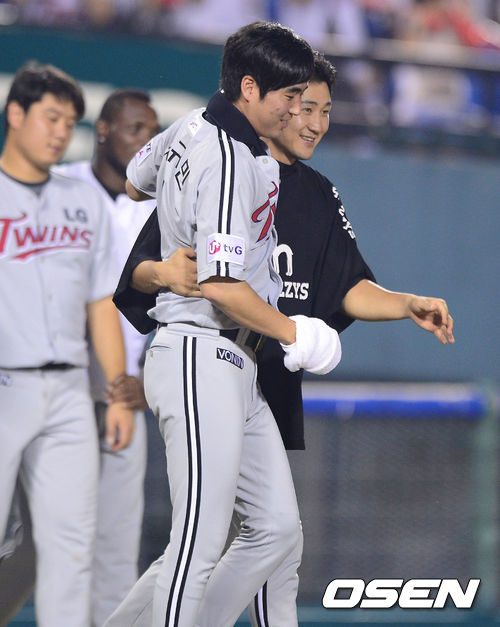 경기종료 후 LG 우규민이 승리투수가 된 신재웅에게 축하하고 있다. / soul1014@osen.co.kr