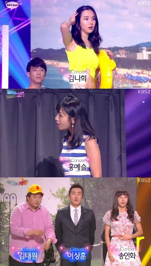 또 '점점점'에서는 김나희가 명품 몸매를 과시했다. 김나희는 해변가에서 핫팬츠를 입고 지나가는 행인으로 등장, 대사가 없었지만 빼어난 외모로 눈길을 끌었다. 특히 김나희는 무대 위에서 살짝 웃는 표정만으로도 그에 대한 궁금증을 높이고 있는 상황이다.