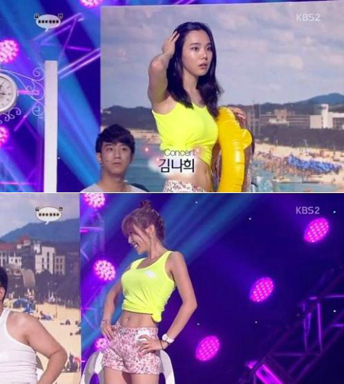 지난 11일 방송된 KBS 2TV '개그콘서트'(이하 '개콘')의 코너 '점점점'에서는 김나희가 명품 몸매를 과시했다. 해변가에서 핫팬츠를 입고 행인으로 등장한 김나희는 대사가 없었지만 빼어난 외모와 몸매로 시선을 사로잡았다.