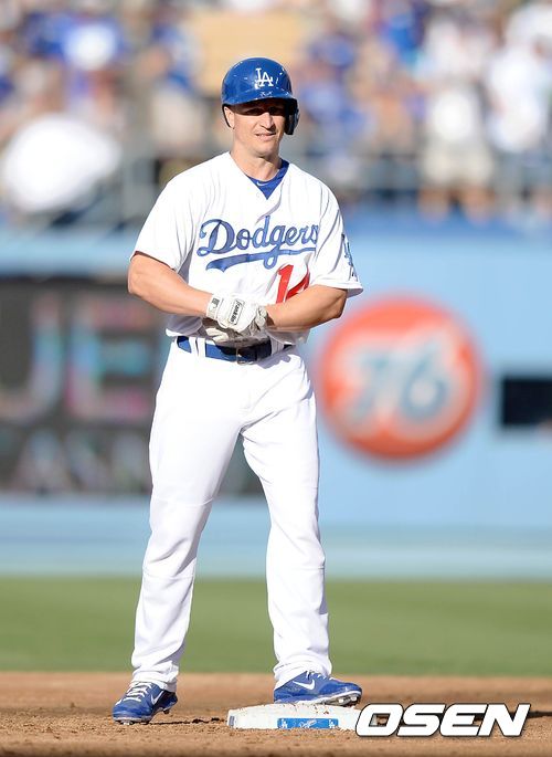 12일(이하 한국시간) 미국 캘리포니아주 로스앤젤레스 다저스타디움에서 열린 2013 메이저리그 LA 다저스와 탬파베이 레이스의 경기, 1회말 1사 1,2루에서 다저스 엘리스가 좌전 적시타를 치고 타임을 외치고 있다.