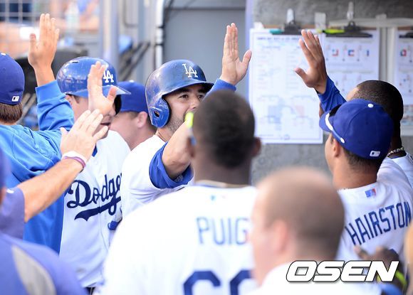 12일(이하 한국시간) 미국 캘리포니아주 로스앤젤레스 다저스타디움에서 열린 2013 메이저리그 LA 다저스와 탬파베이 레이스의 경기, 1회말 1사 2,3루에서 다저스 커쇼의 우전 2타점 적시타 때 홈을 밟은 2루주자 이디어와 3루주자 엘리스가 덕아웃에서 동료들과 환호하고 있다.
