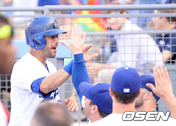 12일(이하 한국시간) 미국 캘리포니아주 로스앤젤레스 다저스타디움에서 열린 2013 메이저리그 LA 다저스와 탬파베이 레이스의 경기, 1회말 1사 2,3루에서 다저스 커쇼의 우전 2타점 적시타 때 홈을 밟은 2루주자 이디어와 3루주자 엘리스가 덕아웃에서 동료들과 환호하고 있다.