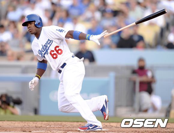 12일(이하 한국시간) 미국 캘리포니아주 로스앤젤레스 다저스타디움에서 열린 2013 메이저리그 LA 다저스와 탬파베이 레이스의 경기, 4회말 무사에서 다저스 푸이그가 2루타를 치고 있다.