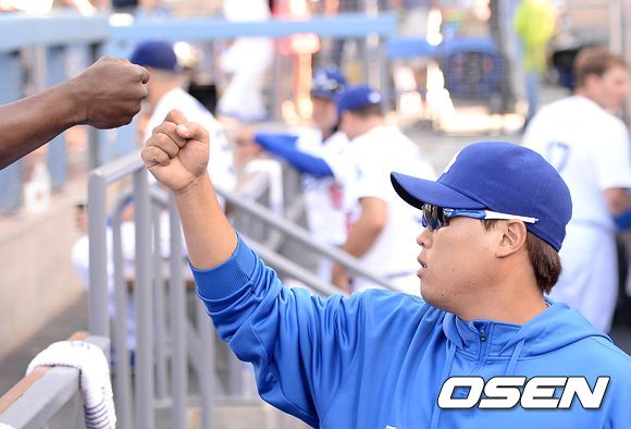 12일(이하 한국시간) 미국 캘리포니아주 로스앤젤레스 다저스타디움에서 열린 2013 메이저리그 LA 다저스와 탬파베이 레이스의 경기, 경기에 앞서 다저스 류현진이 라미레스와 하이파이브를 하고 있다.