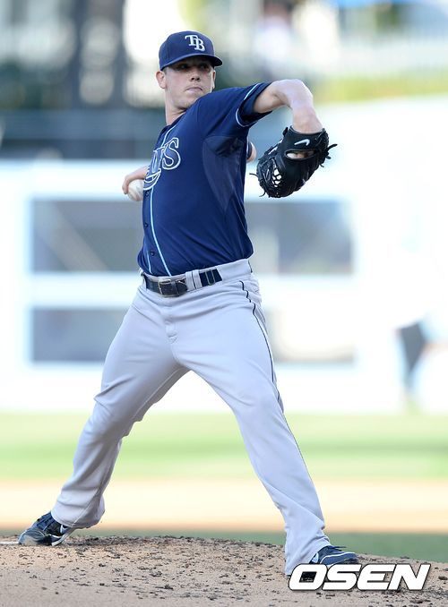 12일(이하 한국시간) 미국 캘리포니아주 로스앤젤레스 다저스타디움에서 열린 2013 메이저리그 LA 다저스와 탬파베이 레이스의 경기, 1회말 탬파베이 선발 투수 제레미 헬릭슨이 힘차게 공을 던지고 있다.